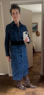 Belted and cowboy boots round out the look. Heavy material so good for fall. Was not a problem for me but it might be a little ’gappy’ at the snaps if it is at all too tight.