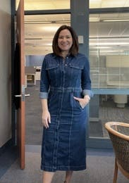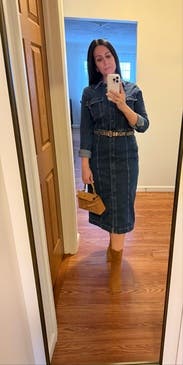 This denim dress was a surprise favorite! I wore it often to work but also out casually—it walks the line perfectly between tailored and relaxed. The long sleeves made it ideal for spring weather, and the fabric had just the right amount of stretch through the chest to stay comfortable all day. I really appreciated the belt loops too—they gave me the option to cinch the waist for a more defined look. It’s a versatile, polished piece that’s easy to throw on and still feel put together.