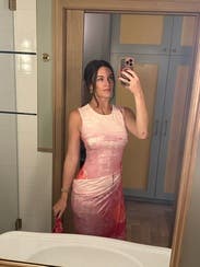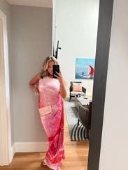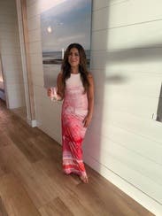 Felt like I matched my cocktail! This dress was so fun for a summer bridal shower - especially in the heat. It was a soft jersey that reminded me of workout athleisure that was OK to sweat in. There are two parts to this dress that are all connected so took me a second to figure it out but once I had the ruched section hit me at the right part of my waist - it was so flattering
