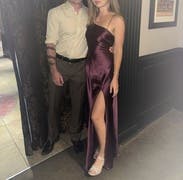 Could not be more pleased with this dress. I wore it to my birthday dinner and it was perfect. The neckline and high slit are so fun and flattering. The material is thick and beautiful. I felt so elegant, I wish it was a tad tighter and that the straps were adjustable (they fell down a couple times), but otherwise very satisfied.