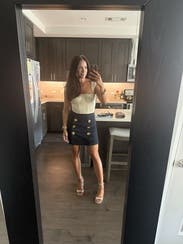 Love this skirt! I wore it to a concert with a sleeveless bodysuit. The gold flower buttons are super cute. Skirt was the perfect length.