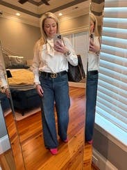 I tried it on when it first arrived, and I didn’t like it, but when I put it on with jeans heels and tucked it in, it really turned out nice. Lots of compliments at church. Oh, and it isnt see through, but it is white so I had to be aware of the bra I wore with it.