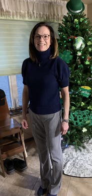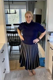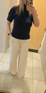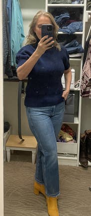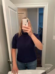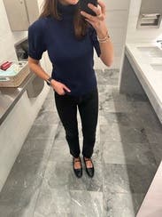 Navy turtleneck sweater with short sleeves. Could wear to work or everyday. It’s a bit heavier than I expected so great for weather in the 60’s and low 70’s.