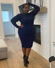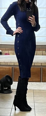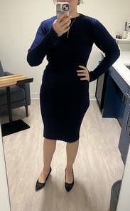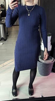 Perfect navy sweater dress! It isn't frumpy or stretched out as many sweater dresses can be...it is this thick yet sleek material that hugs every curve yet hides all imperfections.