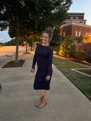 I felt like a million bucks in this dress! The sleeve cuffs were a little awkwardly long if you are at a meal, so just flip them back. Otherwise, they were an interesting feature that moved nicely while you are walking. The buttons on the side can be unbuttoned up to a certain point to show more or less leg. I wore this to our anniversary dinner. As conservative as it appears, it was actually very sexy on and in motion. It's a ribbed, stretchy fabric that doesn't hide much. The dark color makes any lumps and bumps you may have a little less obvious though. Rent this dress!