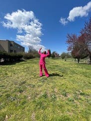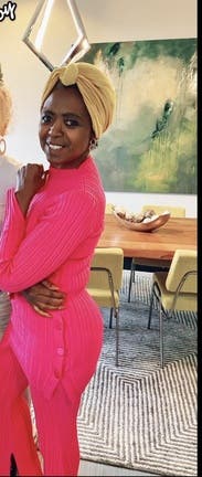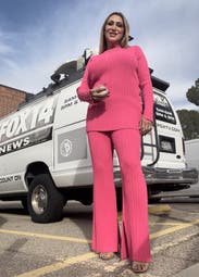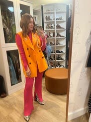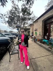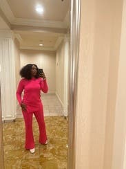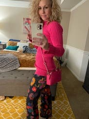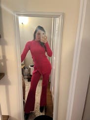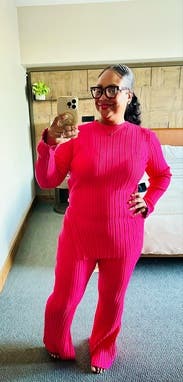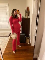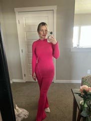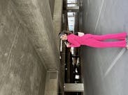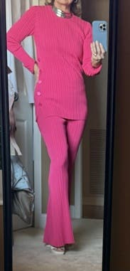 Barbiecore at its best! Super fun set - lots of stretch. I wore my true size when I was in my third trimester and it was super comfy. You can unbutton some of the side to give you some flexibility