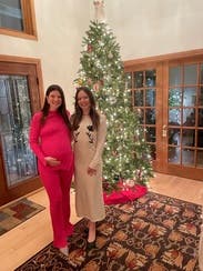 Fun festive outfit for the holidays for someone in their third trimester! Just undo a few buttons to give you room