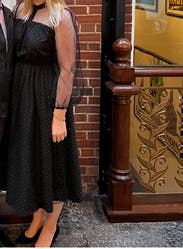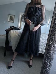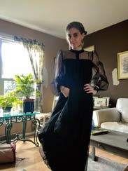 So, so fun! Whimsical, flattering and comfortable (even IF it does look like something Wednesday Adams would wear!) I didn't end up wearing this because I didn't feel it was formal enough for a black tie optional wedding - but I'm so glad to know to rent it in the future for a less-formal event. The elastic waist is hidden by the material - and could easily be covered by a cute belt. I will absolutely rent this again!