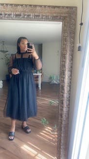 I loved wearing this dress. It felt very unique, got a bunch of compliments. I’m 5’2 so it did hit closer to my ankles than mid-calf. Would recommend pairing with higher heels if you’re petite.
