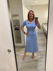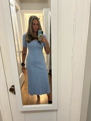 Awesome periwinkle/sky blue - so cheerful - great knit dress/ hugging all the right places. Almost like it’s but on the bias. The fabric is a bit warm and itchy - synthetic- but the gorgeous color is as so worth it! Definitely a mood lifting hue - got lots of smiles. I wore it casually with cream loafers and big vintage pearl earrings for a zoom then ran errands and met a friend for lunch & shopping - it just as easily could be worn with some chic pumps or sporty sneaks …for a diner date : ) cute dress!