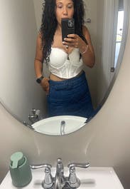 The perfect mini skirt! The quilting and the matching belt elevate this from your average denim mini. Fits true to size in the waist through the hips, and is the perfect length for me at 5'5". The belt is adjustable, so you can really customize the fit here. Pair it with a T-shirt, a turtleneck, and definitely also rent the matching jacket!