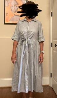 This dress runs a bit big, and I’m just on the cusp of needing to size down. I elected to keep this size though, as I didn’t want to worry about the gaping buttons others had issues with. Dress is very lightweight and comfortable for the heat. Perfect for those days where you need to look put together, but don’t want to wear “hard clothes”. Would rent again!
