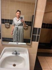 You'll have to excuse the photo, it's not representative of the dress! But I forgot to take a picture when I wore the dress so this is when it was fresh out of the shipping bag for my first try on. Very cute, especially for the office. I took my true size and I'm 4 months pregnant.