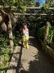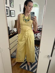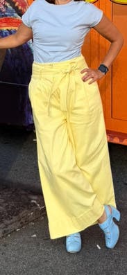 These pants are loud proud yellow which can be awesome in the right setting like a formal spring party. The fabric is very thick & stiff so they dont drape well and crease/wrinkle easily. I wore them out to dinner on vacay but didn’t feel terrific. They need a sandle heel and neutral elegent top to balance everything happening with these pant!