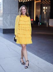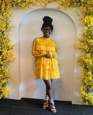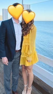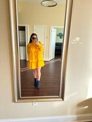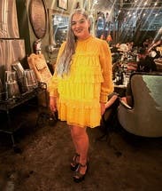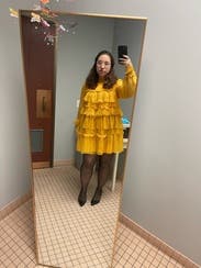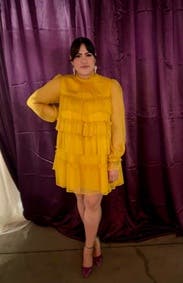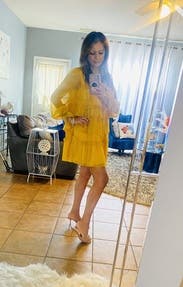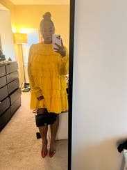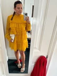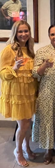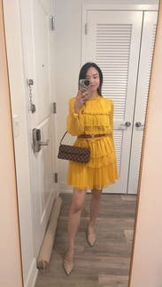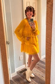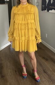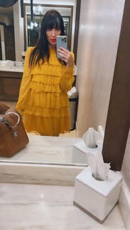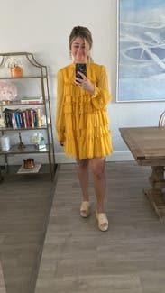 Wore this to a fundraiser that encouraged wearing yellow and this knocked it out of the park. Super comfortable and flattering. It is on the shorter side when you sit down, but totally fine if you’re mostly standing. You’ll need to steam/iron it when it arrives as the ruffles were a little smushed from shipping, but it was quick.
