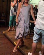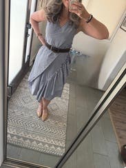 For those of us sized in the double digits, this is a cute dress that cries out for a contrasting belt. Absent that, you’ll be a big blob of ruffles and stripes. Nice lightweight fabric and easy to wear. A little tight in the chest but otherwise great!