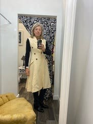 Received many compliments when wearing this piece. It has an hourglass and somewhat boxy shape when buttoned.