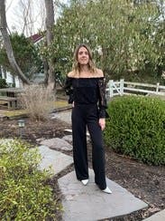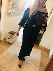 Loved this jumpsuit. Very comfortable, could have been a little longer. Wore on shoulders since it was a work dinner.
