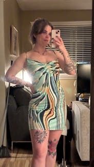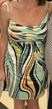 This dress was really unflattering on its own. The print of the dress is really fun but the dress came down to almost knee length at my height and did not flatter my shape at all. I had to belt it and double the top half over the belt to get it to a flattering length. The straps were also really wide set, making my chest look really broad. The straps kept falling down. I paired it with a black blazer to cover up the unflattering chest for and keep the straps in place. Wore to a Bachelorette Party/Girl's Night Out.