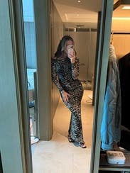 Love this top. It’s fitted but not too tight, a little short so may be more cropped for taller ladies. I would normally be a medium but rented that and thought it was too tight and short. Went with a large 2nd time around. Great with jeans, black pants and also with a black skirt. Also love the matching skirt, but that’s a LOOK so you have to be confident with that!!