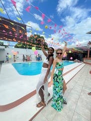 This top was so pretty, but not very functional. I loved the set together, but I was not comfortable doing much of anything in the top. The girls were dying to come out, and so I wore it for the first part of my pool party/dance party then switched into a white swimsuit top (which looked almost as good with the skirt)!