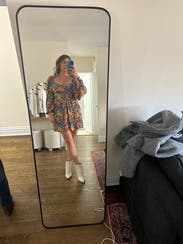 This dress is so cute and flirty! I wore it to a concert and was super comfortable all night. The fit felt good while it was on, though it was a little baggy in the back after it was zipped up. It wasn’t visibly noticeable, though. It looked great on!