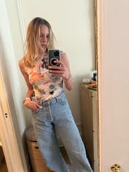 What a cute fun SEE THROUGH shirt. You will need a cami or be OK with your bra showing through. I didn't wear it because the skirt I ordered didn't come in and I wasn't in the mood for jeans in over 100 degree weather. I would rent again if I had something to wear it with.