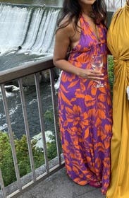 Purple floral crepe (55% Viscose, 45% Rayon). Maxi. Sleeveless. Halter neck. Back zipper closure. See size and fit notes for length measurements. Imported.