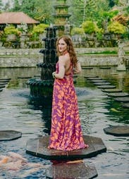 I rented this for my honeymoon in Bali, hoping that it would give a dramatic look for the photo shoot we booked, while also being comfortable enough for everyday activities. Well, I got one of the two. The dress is gorgeous and looked amazing in the photos, but I just wore it the once… for about 30 minutes. It was just way too long (4 inch heels wouldn’t have been tall enough and I packed only flats), not a lounge-worthy level of comfortable, and just generally not very practical. IMO this dress is better for a dressy event, like a tropical destination wedding, than for poolside lounging. Also I didn’t love the two-tiered waistline on me; it looked frumpy and baggy