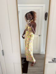 This is the most comfortable jumpsuit ever! The halter tie makes it easy to get the perfect fit and the stretchy material is flattering and ideal for summer. I absolutely loved the bright floral print and got tons of compliments!