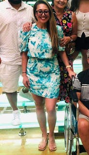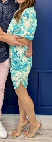 Felt amazing in this dress and got so many compliments! The tie-dye pattern seems off the wall but it works and the turquoise color is beautiful! The ruching is forgiving in the midsection and the tight skirt is very flattering on the hips. Would rent again!