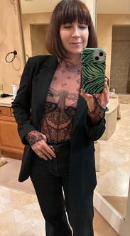 Love the illusion of this top. It’s so good I brought it. The lace lingerie look is perfect to mix and match w/ your regular wardrobe.