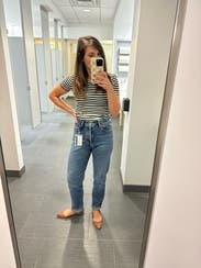 I think everyone knows finding jeans with the perfect fit is kind of like the Holy Grail. I love this brand, but this style is not right for me. I went with the smaller of my usual sizes, but they were still too big. Also they stretched out during the day as I was sitting at my desk. They bunched up at the crotch, and they got baggy around the derrière. I think these would be better for someone taller and maybe less curvy? I don’t even think they would work for me in a smaller size because the proportions are just wrong for my body type. Still a high quality denim that’s worth the rental if the fit is right for you.