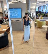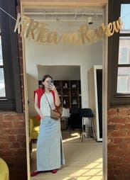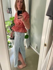 Definitely worth renting, just recommend sizing down 1-2 sizes! I wore a belt to keep mine up and it did the trick. Love the side slits, adds a little flare to the trending denim skirt.