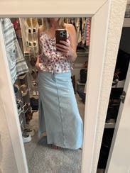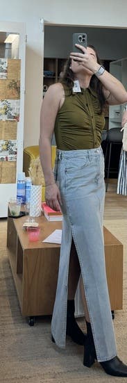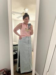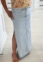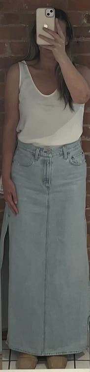 This skirt is perfect except it runs big! I'm usually a 26 or 2/4 and the 26 in this skirt was too big but the 25 fit perfectly! It's such a great transitional skirt, good weight of denim and long but with tall side slits that make it easy breazy. Love the light wash too. Perfect with a light sweater or button down for work and t-shirt for weekend days. Team RTR Review