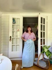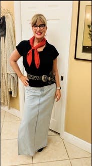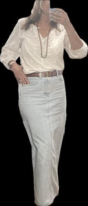 This is great, easy with the side slits & the light denim is nice and casual. It works with tucked t's, bodysuits, blouses & oversized shirts. Had to own it. It does wrinkle a little easily for denim.