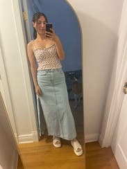 I sized down two sizes in this and it was still a little too big in the waist but ended up being almost too tight in the hips. A fun skirt to rent but wouldn’t buy. Loved the light denim color!