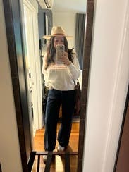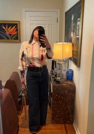 I rented the look by getting these jeans and vest. It was perfect for Cowboy Carter. I'm not typically a dark denim girl but these were fun. They run a bit long if you wear it with sneakers, but with heeled shoes they are fine. Agolde typically runs a bit large for me, but since I have a smaller waist and larger hips I rented a 27 so I wouldn't feel any tightness in the hips (the Agolde jeans I own myself are 26 but they are broken in). The 27 was a bit large for me in the waist, but it didn't bother me.