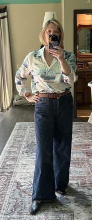 These are wiiiiiiiide leg, wide everything - I loved the deep color and the leg styling overall, but ultimately these are very stiff and structured, and the waist is at least 3" bigger than I expected. The button fly was kind of a fun surprise, but when added to the bulk and heaviness of the jeans I just didn't love them. Nice and long for tall girls (hit right at the floor but didn't drag for 5'8"). Definitely size down if you are going to try these. My rating approach: (5=LOVE LOVE; 4=Will rent again, a couple of details I would change; 3=Works but meh; 2=Won't rent again, but may work in some cases; 1=This should be burned). I am on RTR to try new styles and find sizes for my post-menopausal weight/body shape.