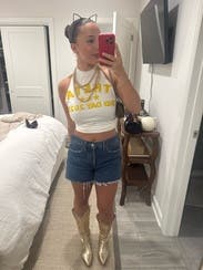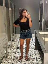 I love this brand of denim! I own a few pairs of this short in the shorter style and find that they fit pretty tts but I feel I could have comfortably sized down in these. Otherwise, these are my perfect shorts! As I get a little older, I find that I don’t love wearing super short shorts and these are a perfect length. If you aren’t familiar with this brand, just know that this is a thicker, more rigid denim with zero stretch. I’d say if you have a bigger booty, go with your normal size. If you’re more straight and narrow, size down.