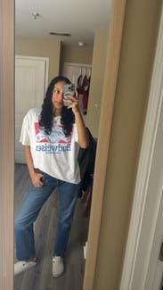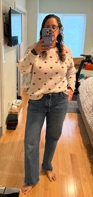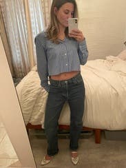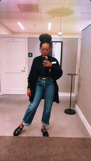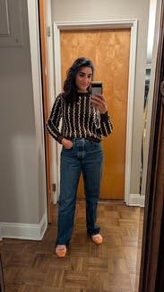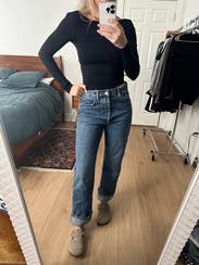 The perfect slouchy jeans. Wore cuffed with Docs and sneakers for casual weekend wear. They stretched out with wear so I ended up sizing down and purchased because I haven't found a comfier, more flattering baggy jean.