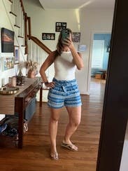 Loved this style and fit (took my larger size and it was perfect - there is no give or stretch in these). Paper bag style is so cute, but it lost its structure by the end of the day and kind of fell over.