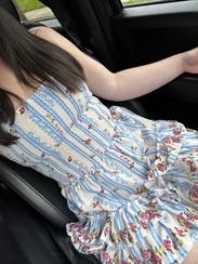 The dress has a playful, summery vibe with a blue-and-white striped base and small floral patterns. The smocked bodice creates a flattering fit, while the tiered ruffle skirt adds bounce and a youthful silhouette. Overall, it's fun, flirty, and perfect for sunny days, combining casual ease with pretty details. The smocked fit and ruffles give it a flattering, youthful energy.