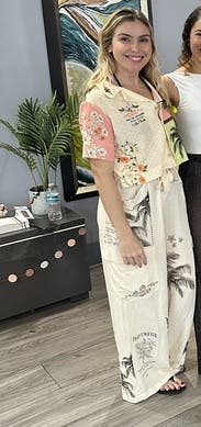 Obsessed with this laid-back matching set! The tropical-print pants and cropped button-up give effortless vacation vibes. Just note: the pants run very big, even the small was too loose on me.