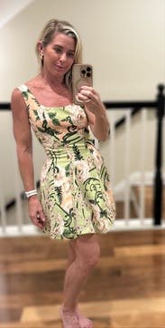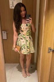 Such a fun and flirty mini! The shape of this dress is incredibly flattering and has so much detail in the prints. You Literally have to give it a twirl :). The top of this dress is slightly tight. I would definitely recommend sizing up for some extra breathing room, as well as if you have a larger bust.