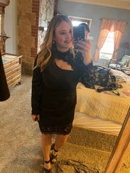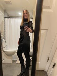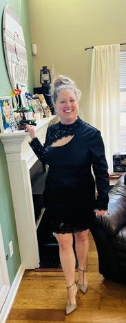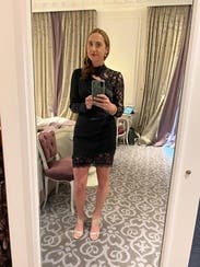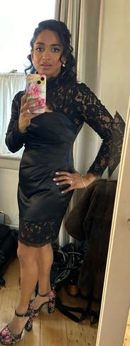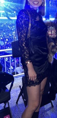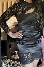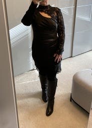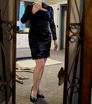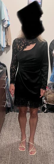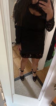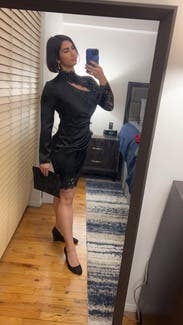 You can't see the full dress in this photo but I didn't have a full body pic , still wanted to review because the dress is amazing! Has some stretch to it and it is so sexy even though the lace neckline comes up high. It's definitely short and tight at the bottom.