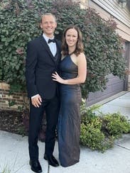 Photos do not do it justice...the dress is a beautiful blue/copper that changes in the light! I wore it to a formal dinner. It has a good amount of stretch that should flatter every body type. The top is lightly padded. It was a little long on me, but I wore my tallest heels, and the front slit helps with walking.