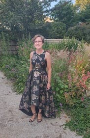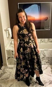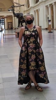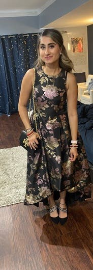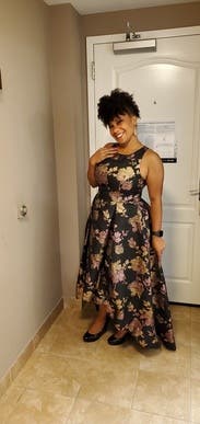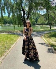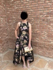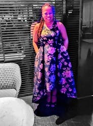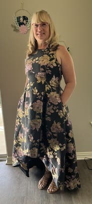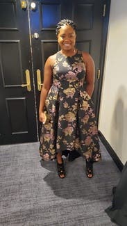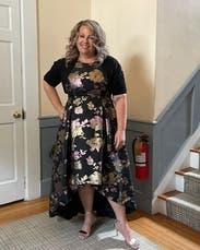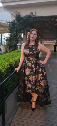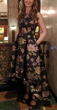 I wore this to my nonprofit's fundraising gala and I got the most amazing feedback. The holographic flowers really make this one stand out, and I had people telling me multiple times that they noticed me from across the room. I felt great in this and the pockets leveled it all the way up. The asymmetrical hem kept it from being stuffy. It's a little tight in the chest (I'm a 40DD) and I had to have help zipping it up. Other than that, no notes - you can't go wrong with with this one.