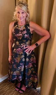 The best thing about this dress was it being short in the front and long in the back didn’t have to worry about wearing a higher heel. Super easy material that didn’t wrinkle. Beautiful floral design. Was very complementary.