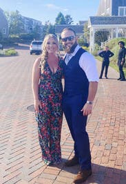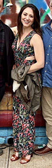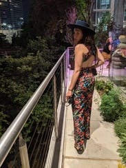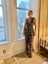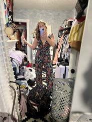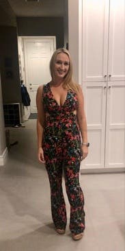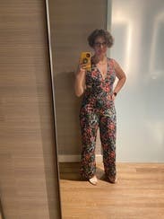 The dress code for the wedding was “black tie, florals encouraged.” This jumpsuit was SUPER comfortable, supportive and secure through multiple hours of dancing (and jumping). I wore a sticky bra for modesty but was not concerned about falling out at any point. The open-back design also allowed it to accommodate my longer torso, which had been an issue with other jumpsuit. Word to the wise: I am 5’8” and wore a low heel and the pants were still a little long on me. I wish I had come prepared with safety pins to adjust the length. Overall, very happy with this rental. I don’t own anything similar, which made it even more of a treat to wear.